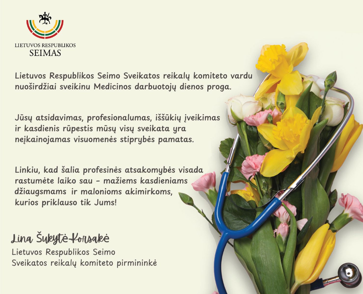Seimo Sveikatos reikalų komiteto pirmininkės Linos Šukytės-Korsakės sveikinimas medikams